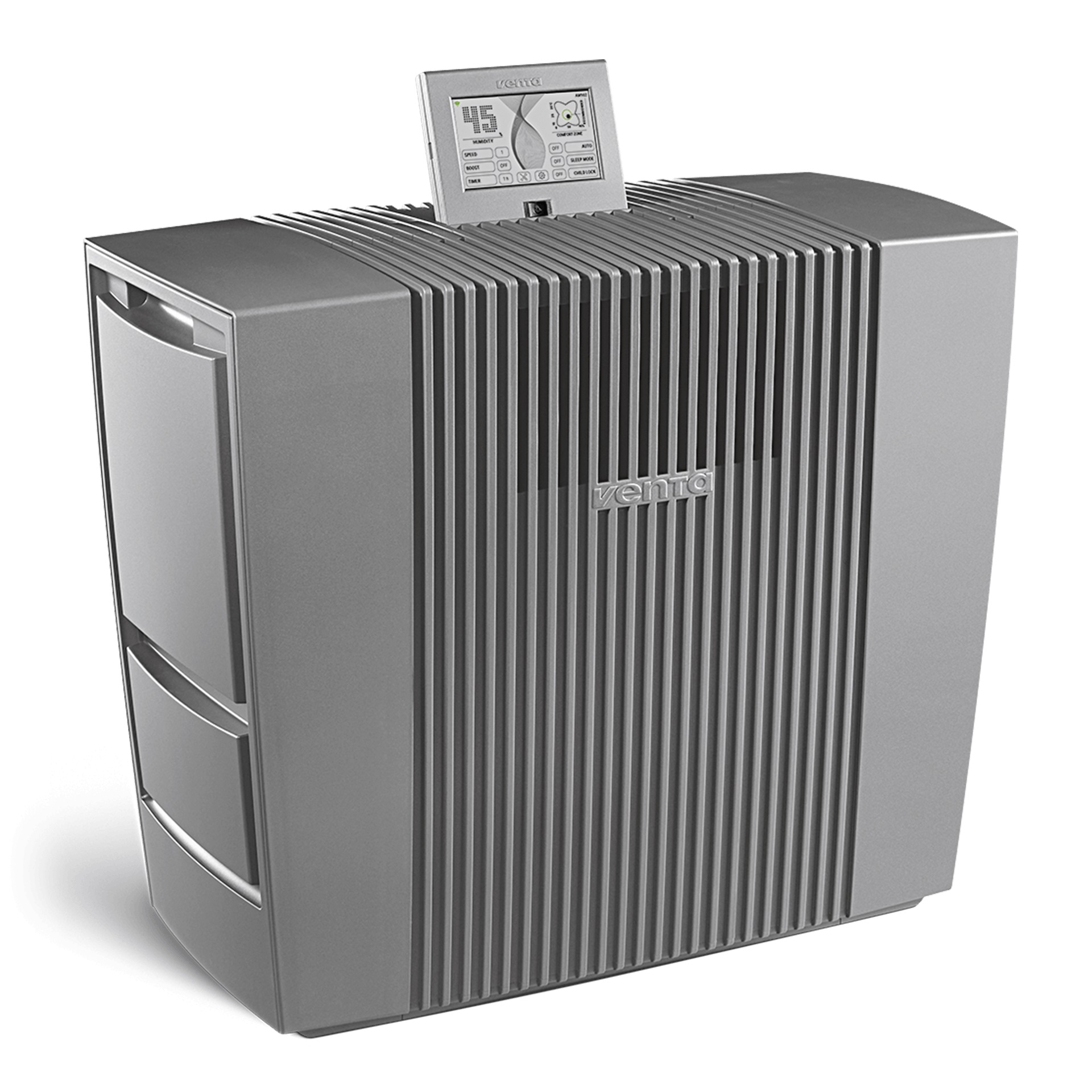 Как и все прочие мойки воздуха Venta, данная модель увлажняет и очищает воздух по принципу холодного испарения, что полностью исключает образование белого налета и конденсата на окружающих AW902 предметах. Однако теперь принцип холодного испарения выведен на качественно новый уровень.Мойка воздуха AW902 Professional – это центр управления климатом в вашем доме: